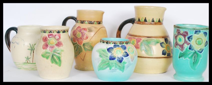 A collection of 20th Century Bretby handmade jugs having engraving floral sprays with hand painted colouration. Stamped Bretby to the bases. Highest measures 23 cm