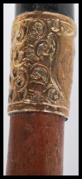 A 19th Century Victorian walking stick cane having a tapering bamboo shaft with shaped tortoiseshell handle and yellow metal gold collar. Measures 91 cm long.