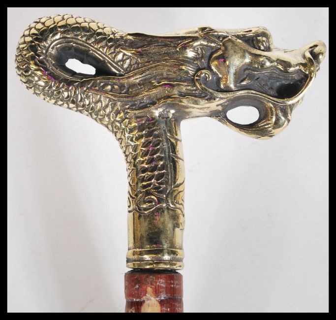 A bamboo walking stick having a brass handle in the form of a Chinese dragon. Measures 29cm high.