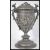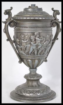A 19th Century French cast metal / pewter twin handled urn raised on circular pedestal base decorated with acanthus leaves. The central body decorated with relief scenes of cherubs with grape and vine. Twin scrolled mythical beast handles to sides. Stamped number to base 1549. Later converted to electricity. Measures 26cm high x 18cm wide.