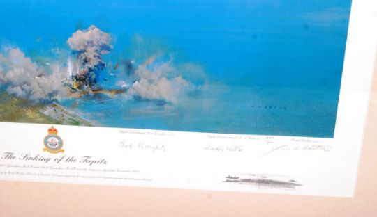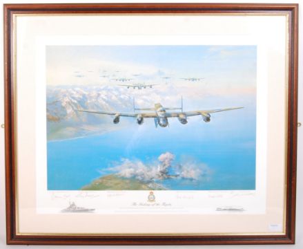 ' Sinking Of The Tirpitz ' by Frank Wootton - a beautiful framed and glazed limited edition print depicting the Lancasters of 617 Squadron over the Tirpitz on 12th November 1944. Autographed to the margin in pencil by 5x veterans - Freddie Watts, Bob Knights, MB Flatman, TC Iveson, James Tait and the artist. Framed to a total size of; 70cm x 84cm. * a percentage of the hammer price of this lot is donated towards ' The Attack On The Sorpe Dam ' film.