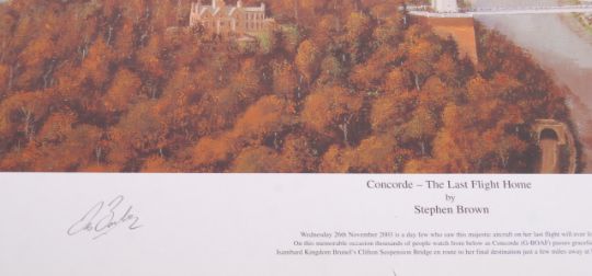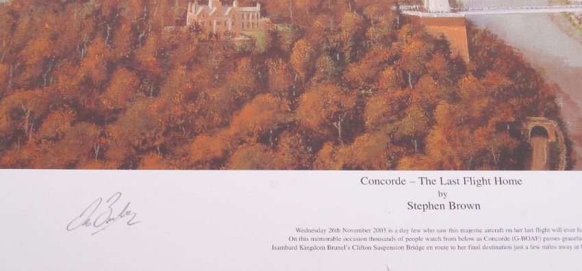 ' Concorde - The Last Flight Home ' by Stephen Brown. Limited edition print depicting Concorde's last flight over the Clifton Suspension Bridge. Signed by the artist and Captain Les Brodie (Pilot). 40/1000. Unframed. 47cm x 71cm.