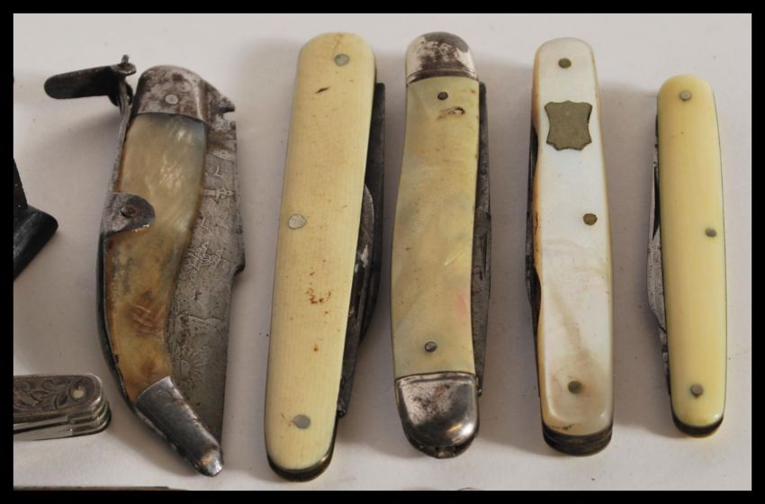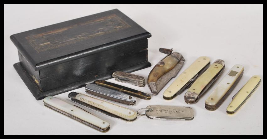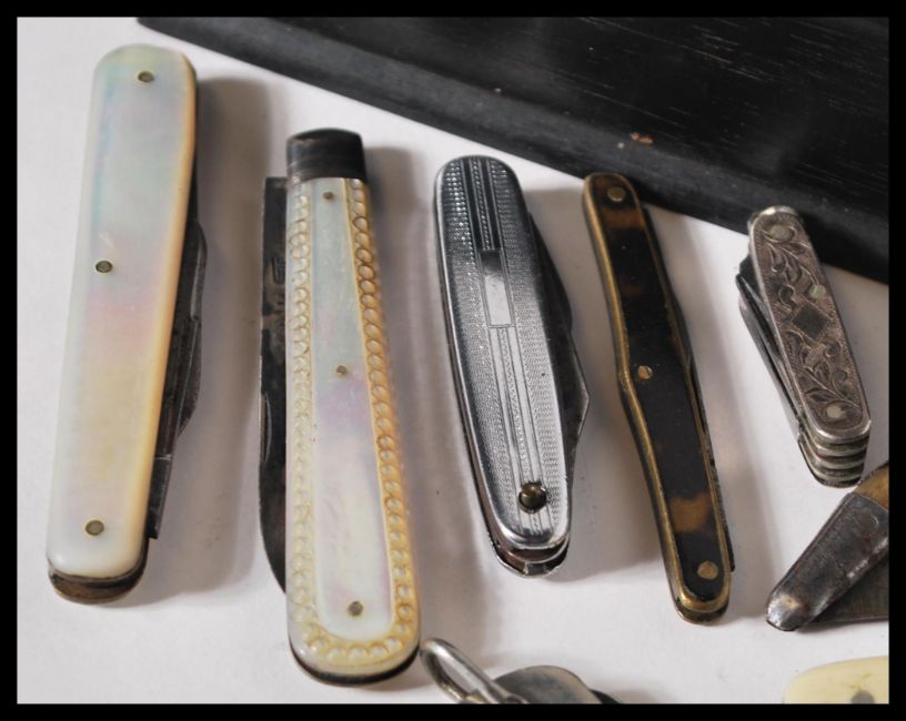 A collection of vintage 20th Century folding penknives to include a silver bladed fruit knife with mother of pearl handles,tortoiseshell handles example and others. 4cm high 13cm wide box.