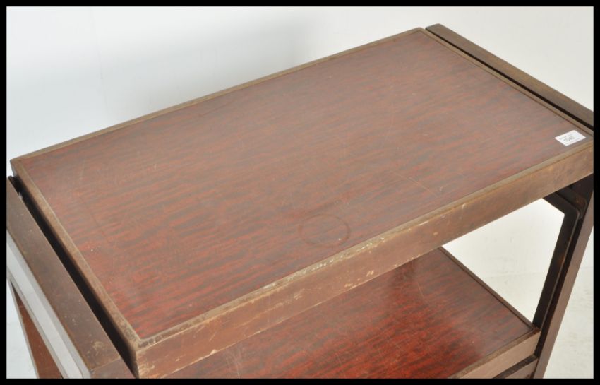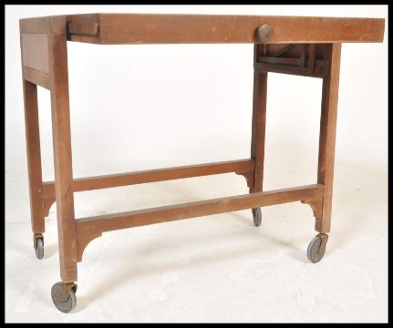 A vintage retro mid century  metamorphic two tier tea trolley. The top having swivel action to create a large top surface and caster wheels. Measures: 69cm high x 77cm wide x 38cm deep.