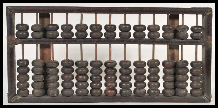 A 19th century Chinese abacus of typical beaded form, the top with applied brass supports to the corners of the frame. 18cm high 38cm wide.