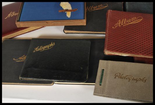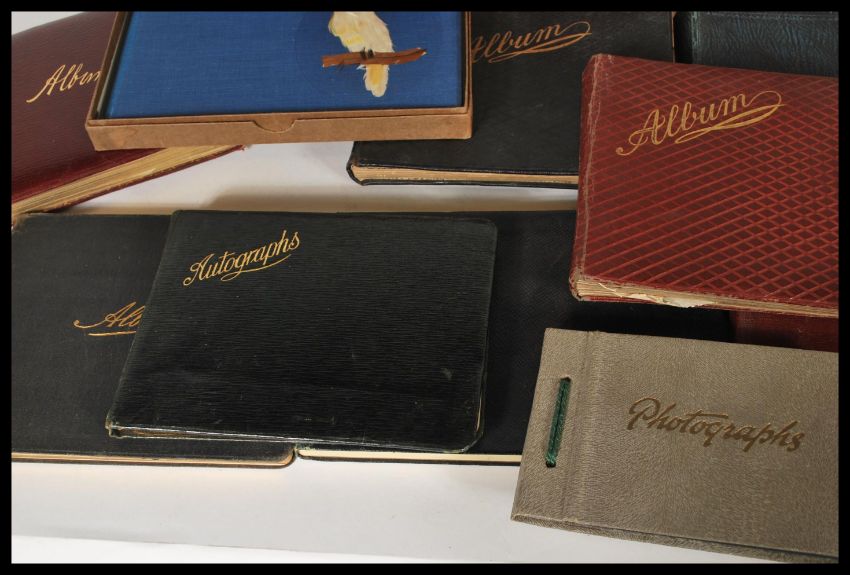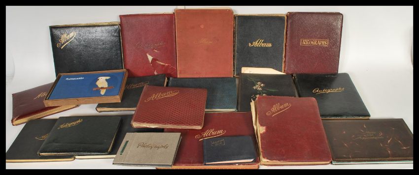 A large collection of x20 charming antique larger-sized autograph books - each containing sketches, poems, ditties, paintings etc. To include; charming watercolour of Stonehenge, watercolour of a seascape disaster, one album filled with early 20th century Religious poems and signees, a Henleaze Music Club register book for the 1930's (filled with all those who attended the club every sunday, guest speakers etc),  a charming 1930's unused autograph book (boxed) with Parrot motif to front, and others. Charming and fascinating collection. Largely 1890-1930's.