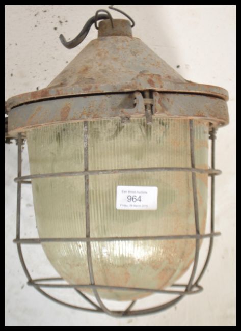 A pair of retro 20th Century industrial factory bulk cage lights, having a cast iron body, glass protection over bulb in a wire cage.Measures: 30cm high x 24cm diameter.