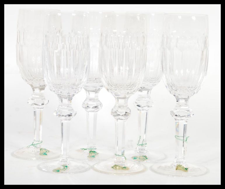 A set of 6 Irish Waterford crystal wine glasses. Facet cut stems with deep bowls all having the Waterford labels. 21cm high.