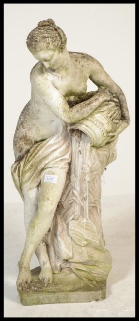 A 20th Century cast concrete composite weathered garden stoneware figurine in the form of a classical maiden / bather holding vase draped in linen. Raised on naturalist base. Measures: 75cm tall.