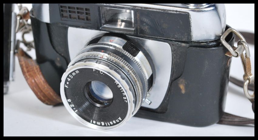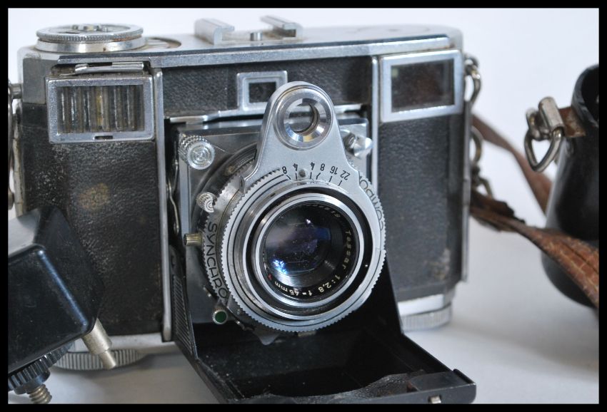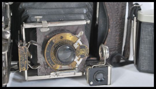 A collection of vintage 20th Century Cameras to include a Zeiss Ikon folding camera model A 5695, Kodak folding camera, Weimar Lux light meter, Halina camera etc.