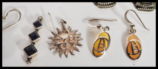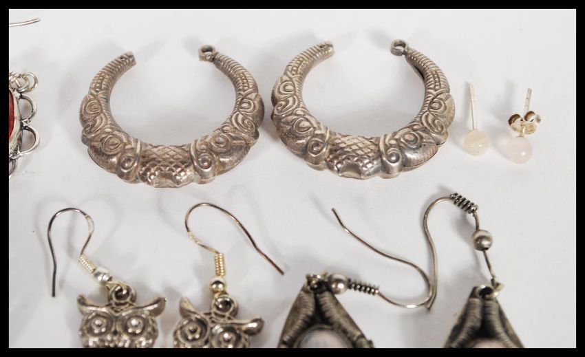A selection of silver earrings to include a pair of embossed ethnic style earrings, earrings set with orange stones, a pair of drop earrings with blue stones, a pair of drop earrings with pierced decoration and a pair of drop earrings in the form of owls. Total weight approx 49.0g.