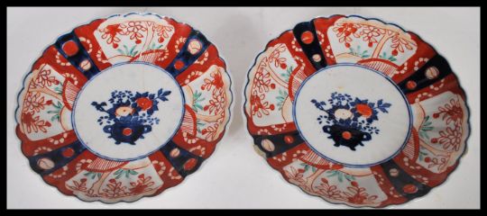 A pair of 19th Century Chinese plates of scalloped form, central panel decorated with potted peonies surrounded by decorative floral panel border. Measures 22cm across.