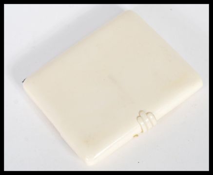 A vintage celluloid Art Deco 1920's cigarette case including a celluloid folded hand clasp with an inlaid white stone into the bracelet design and a blue and white border to the opening. Measures: 8cm high x 9cm wide.