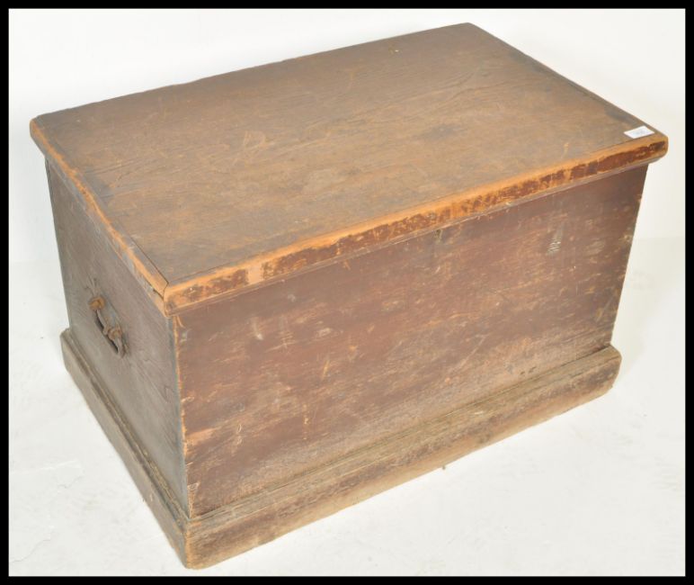 A 19th Century pine trunk coffer chest box having wrought iron drop handles and having painted top. The long rat tail hinged lid opening to reveal a spacious interior.