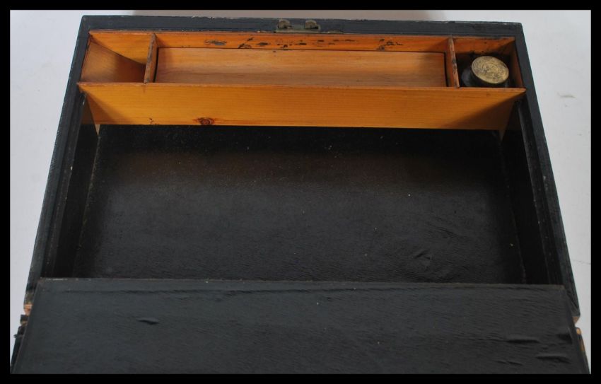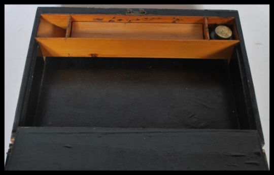 Two wooden writing boxes to include a 19th Century Victorian Tunbridge Ware inlaid writing box having two bands of inlaid geometric banded decoration with brass scutcheon and compartmentalised interior along with a swing handled writing slope box. 10cm high 30cm wide biggest.