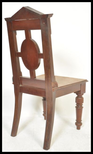 A Victorian 19th century solid mahogany hall chair raised on turned legs with solid panel seat having carved back splat with central oval plaque and arched top rail