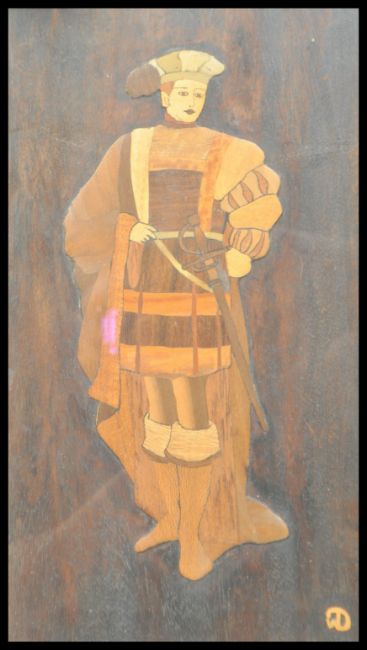 A pair of framed and glazed specimen wood inlaid pictures, the woods to include Rosewood, fruitwood, mahogany, walnut. The pictures modelled as ladies in classical dress.