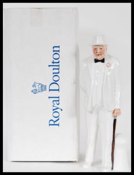 A Royal Doulton hand made and hand decorated porcelain figure of Sir Winston Churchill HN 3057 retired 1984, modelled by Adrian Hughes. Measures 27cm high.