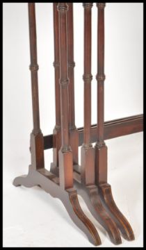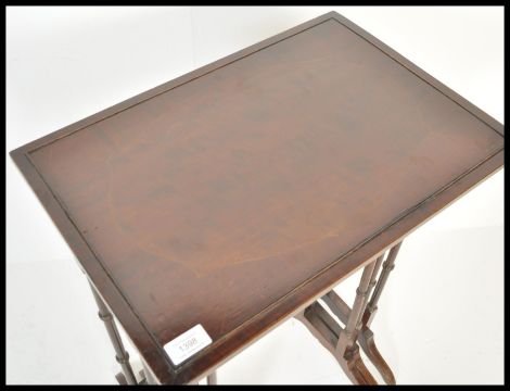 A pair of 19th Century Victorian mahogany nest of three tables having boxwood inlay decoration with sycamore veneer central cartouche panels. Measures: 71cm high x 50cm wide x 31cm deep.