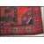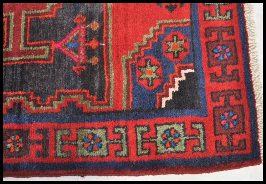 A Persian Islamic tribal Bakhtiari hand made wool rug / floor carpet having a red ground with geometric patterning, being professionally cleaned and using natural dye.