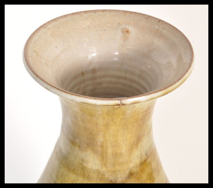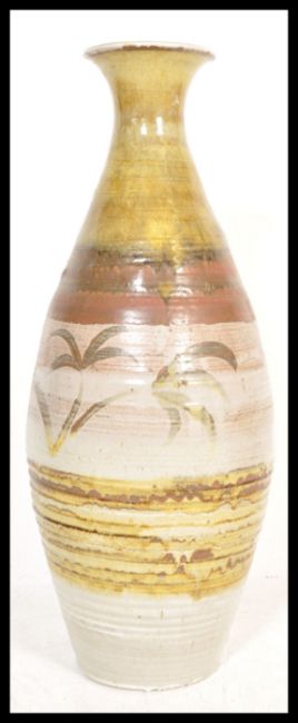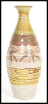 A large floor standing 20th century retro drip salt glaze vase having bands of colour with a central band having palm tree decoration. The vase shape having the classic wide tapering body and flared rim to top. Measures;  92cm tall.