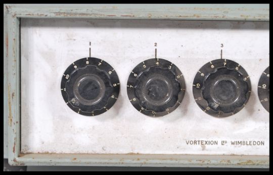A rare vintage 20th Century retro Vortexion Ltd Wimbledon 4:1 mixer amplifier 4C/FET/100/MXR designed to mix two mics, record player and tape or aux signal into a 100V line PA system. All housed within a painted metal case with white front bakelite knobs and chrome switches. 17cm high 46cm wide.