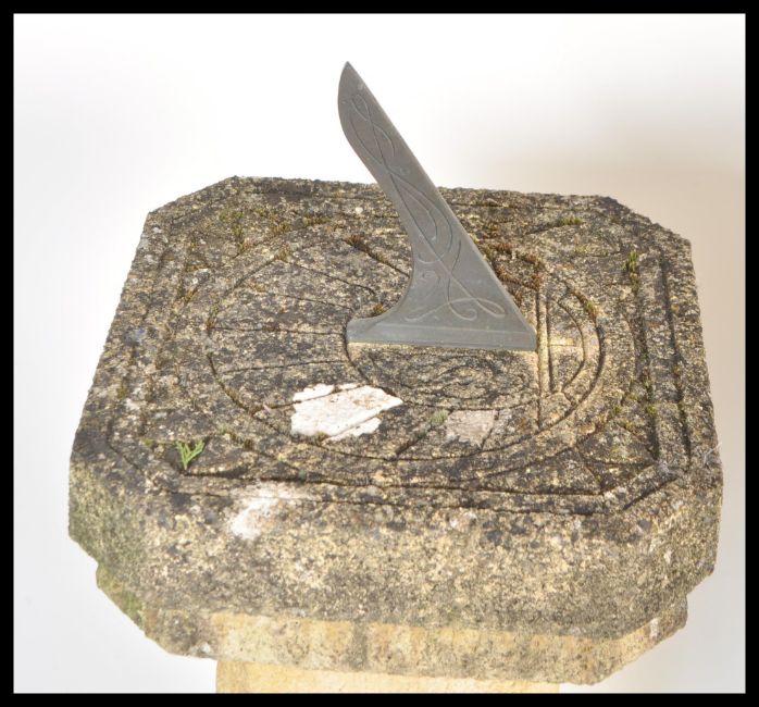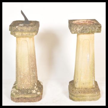A pair of 20th Century matching well weathered garden stone sundial and bird bath raised on tall stone columns.