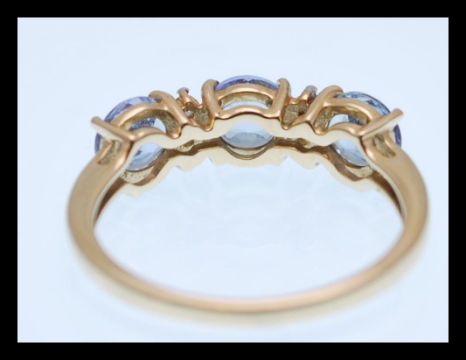 A hallmarked 9ct gold ring prong set with three brilliant cut light blue stones having four white accent stones between. Hallmarked Birmingham 2015. Weight 2.0g. Size L.5.