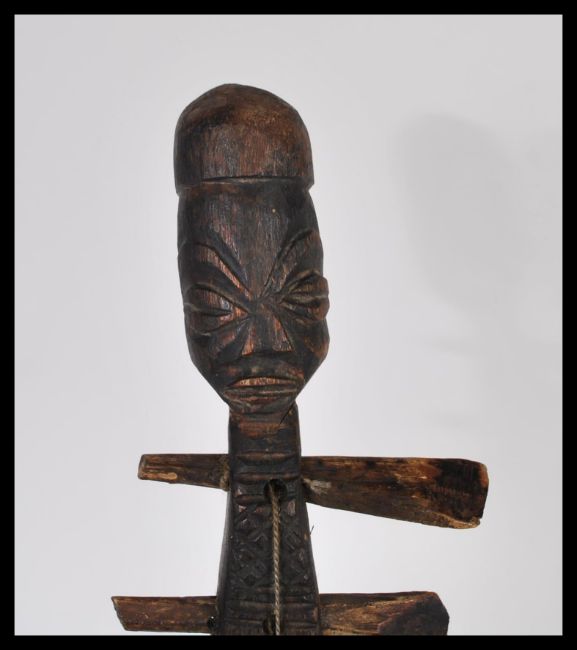 Tribal Art - a vintage 20th Century African Adungu-type string instrument fitted with three strings, carved figural stem, hide covered sound box,