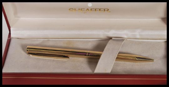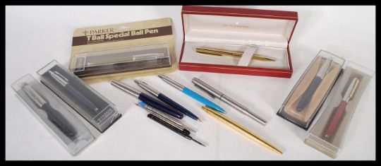 A collection of boxed Parker mechanical ball point pens and refill cartridges, along with a boxed Sheaffer pen. Average size 13cm long.
