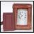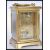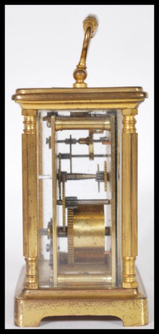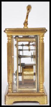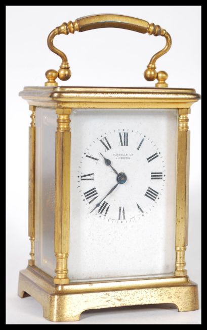 A 19th Century Victorian gilt brass cased carriage clock by Russell Ltd of Liverpool. The white enamel face having Roman numeral chapter ring with faceted hands. In leather case. 14cm high 10cm wide.