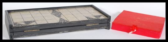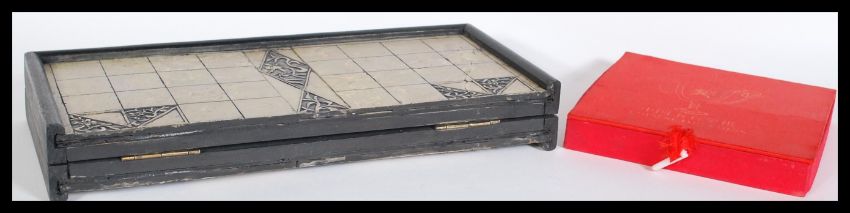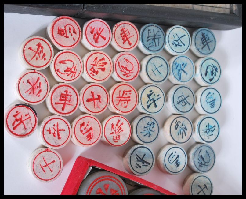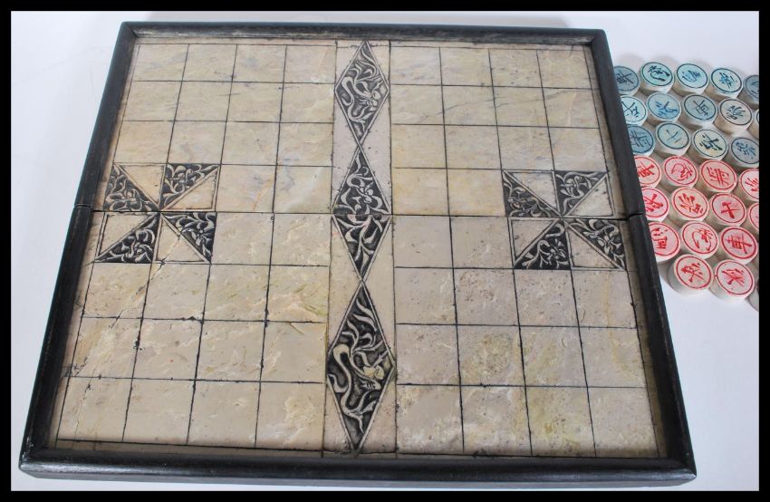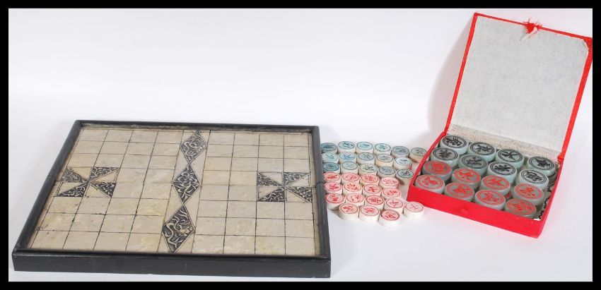 A 20th century Chinese checkers board game having stone counters gaming pieces having calligraphy lettering contained within a marble board. Board measures 37cm x 37cm. Together with a set of thirty two Chinese jade gaming counters / draught pieces complete in fitted case. Box measures 18 cm high and 18 cm wide.