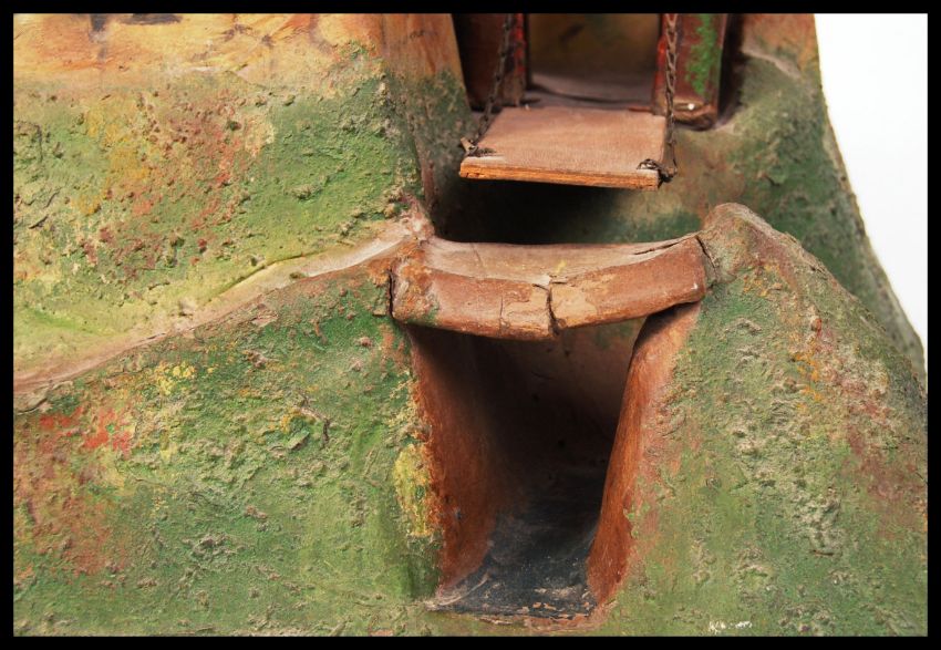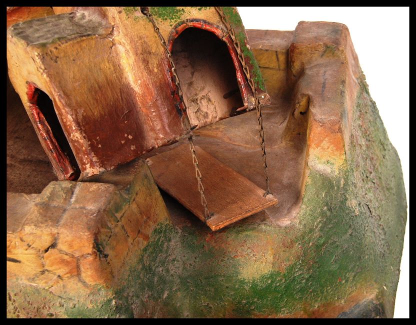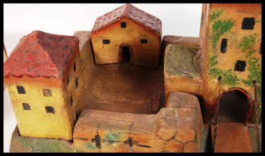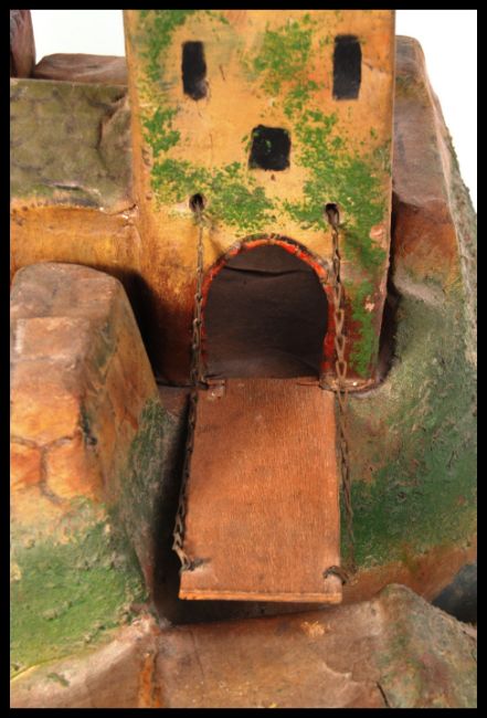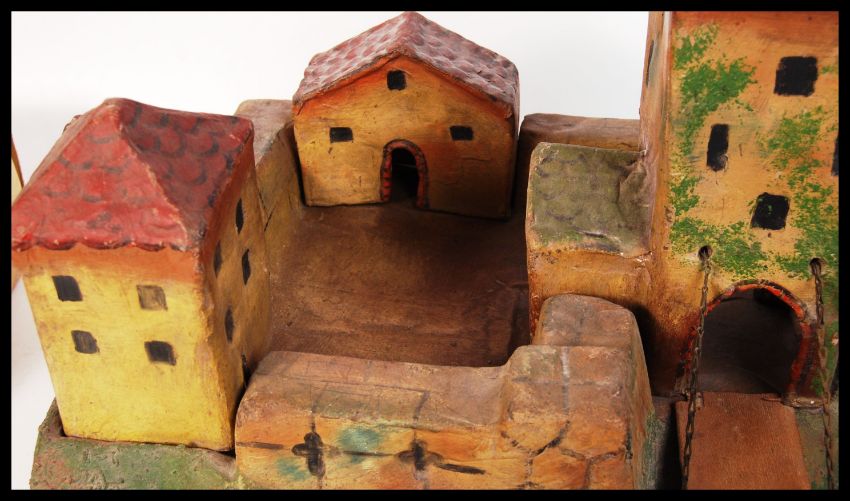A rare antique late 19th / early 20th century papier mache toy soldier fort. Complete with bridge, drawbridge and removable buildings. Hand painted. No makers marks, but very well made. Measures approx; H45cm x W51cm x D48cm. Rare.