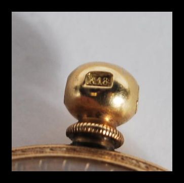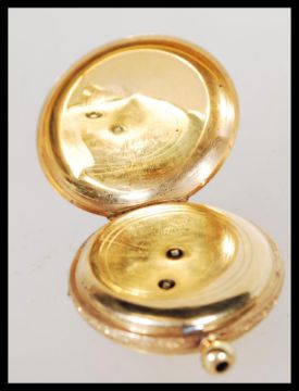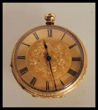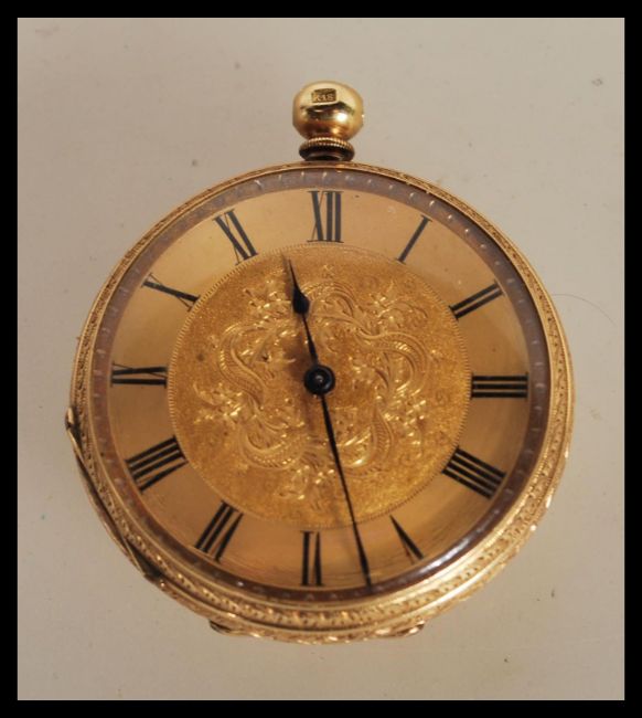 An early 20th Century continental fob open face pocket watch within a stamped 18k gold case, having a gold tone face with roman numerals to the chapter ring and faceted hands. Stamped 18k to interior of case and to the crown. 38cm diameter.