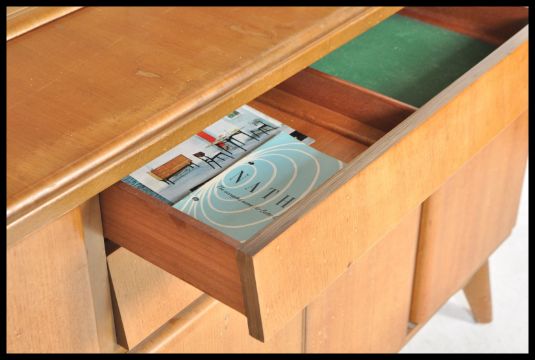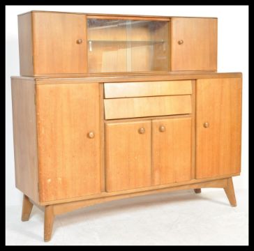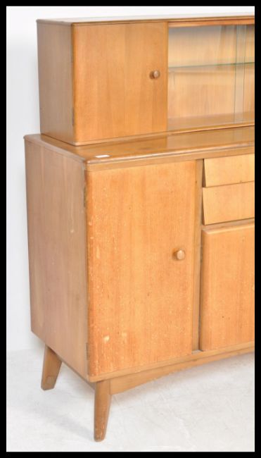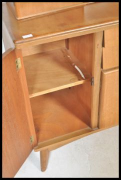 A vintage mid 20th Century NAthan teak wood sideboard credenza, having a configuration of cupboards and drawers with glazed shelves above raised on tapering supports.