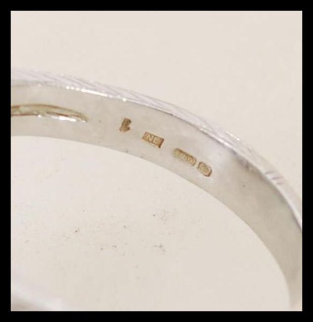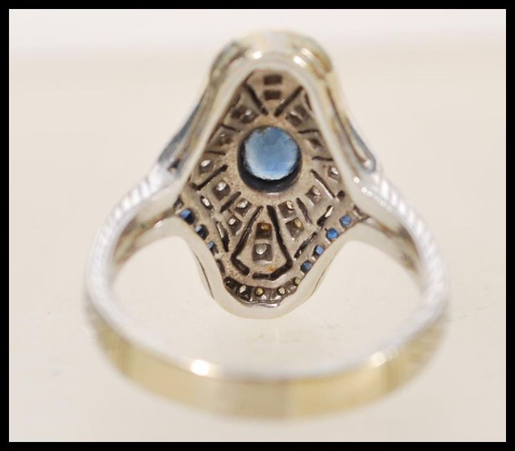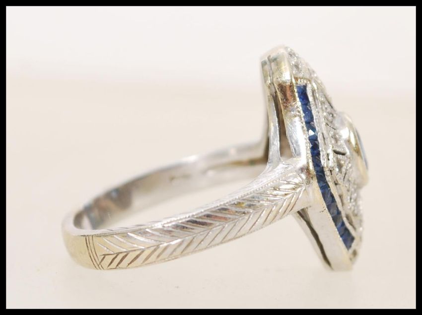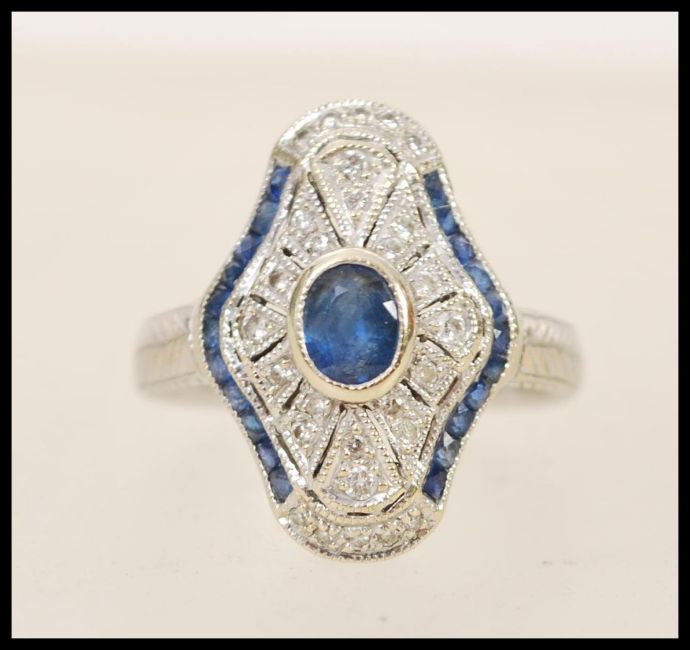 A 1920's 18ct white gold art deco panel ring set with a central oval cut sapphire in a shaped diamond set pierced surround with sapphire accent stones, engraved to the shank with geometric patterning. Hallmarked Birmingham, stamped 750, size P.5, weight 7.6g.