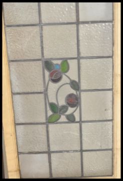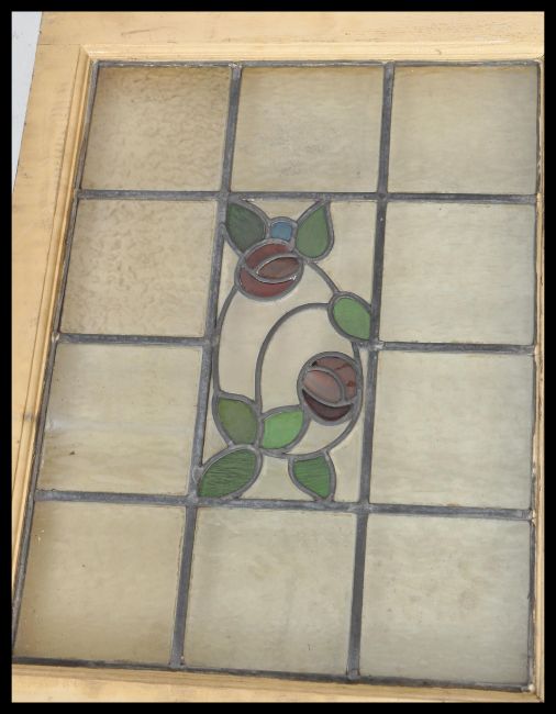 A set of early 20th century painted pine leaded and stained glass windows. Painted wooden surrounds with good decorative leaded and coloured glass scenes. Measures: 89cm high x 49cm wide.