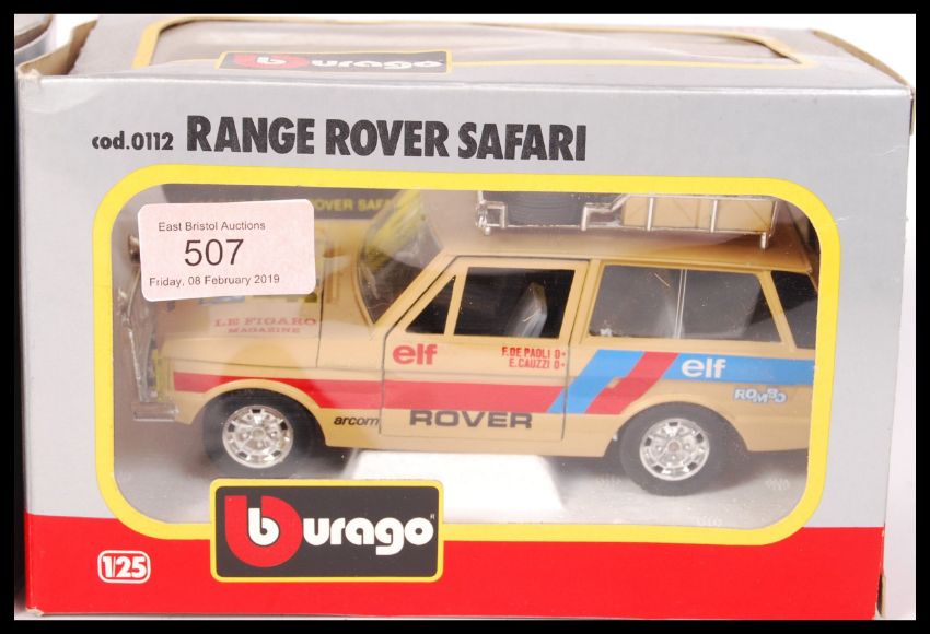 Two original Bburago ( Burago ) 1:25 scale diecast model vehicles to include; cod.0106 Land Rover Aziza and cod.0112 Land Rover Safari.