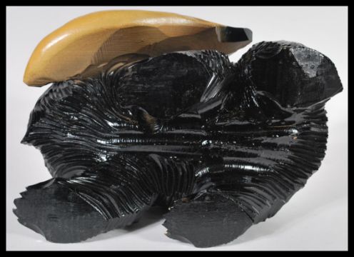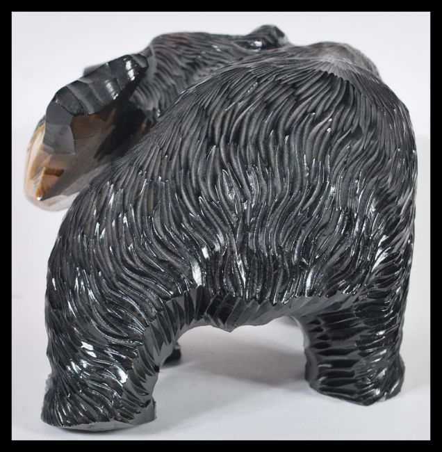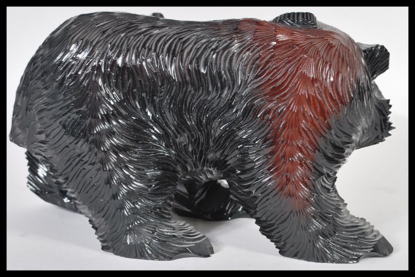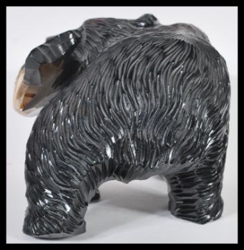 A 20th Century Canadian hand carved wooden fine large figurine in the form of a bear catching salmon fish in mouth with red lacquer finish. 16cm high 31cm wide.