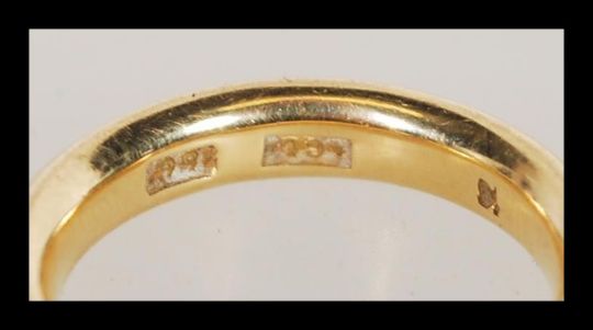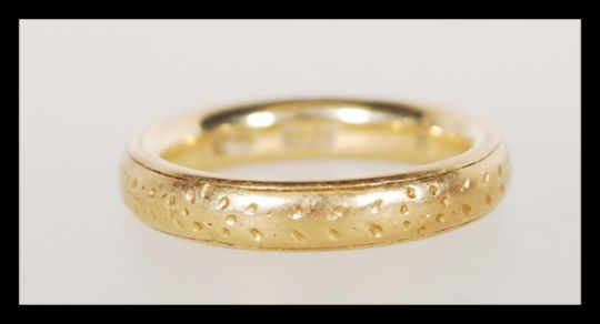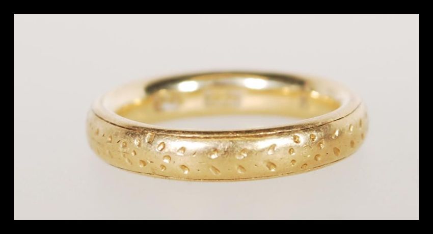 A stamped 18ct gold band ring having floral engraving. Size I. Weight 5.6g.