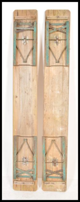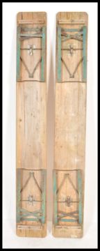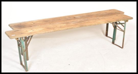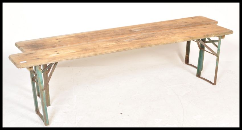 A pair of late 20th century continental retro vintage brewery festival folding benches having painted tops with metal legs and clips.