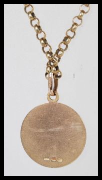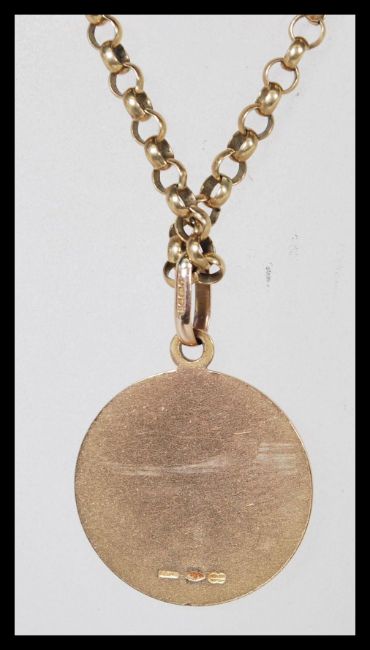 A hallmarked 9ct gold St Christopher pendant on a hallmarked 9ct gold figaro chain link necklace. Chain length 20", gross weight 15.6g.