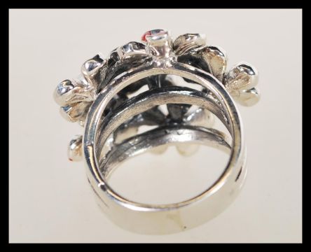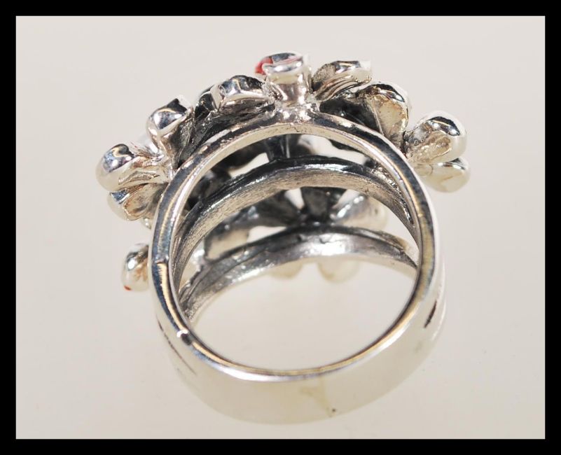 A sterling silver freshwater pearl and enamel set ring having floral red enamel clusters with central pearls. Weighs 12 grams size N.