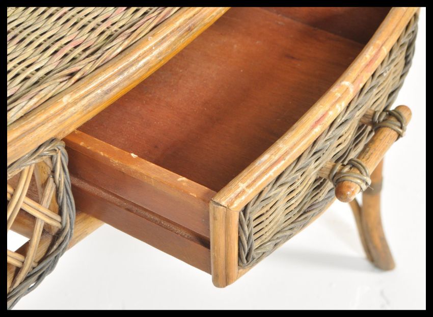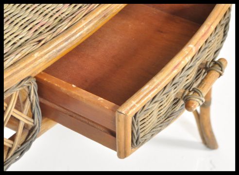 A 20th century retro ladies whicker weave dressing table and wall mirror. The wall hanging mirror with decorative whicker surround. Set over dressing table beneath.
