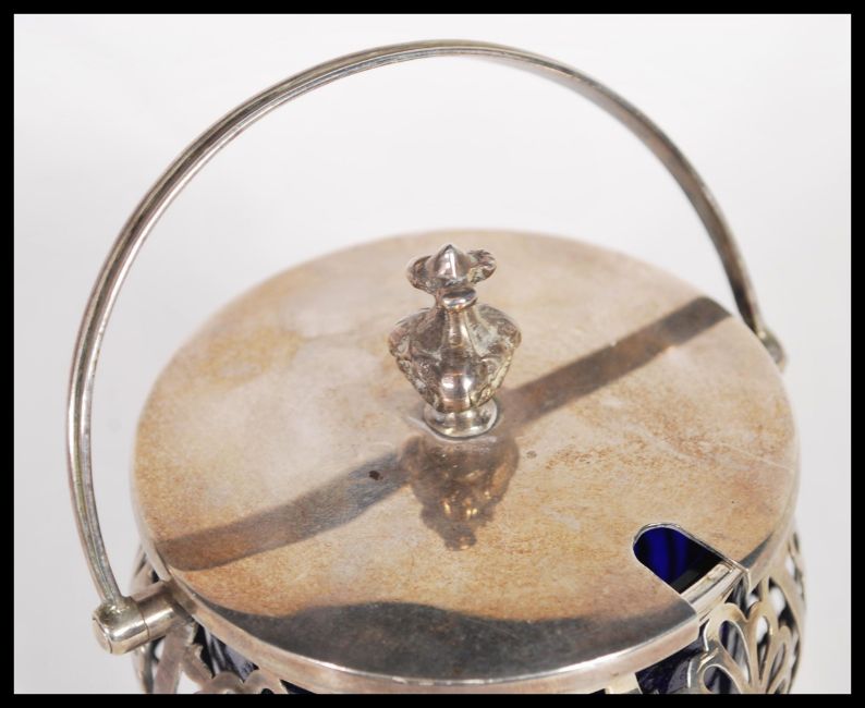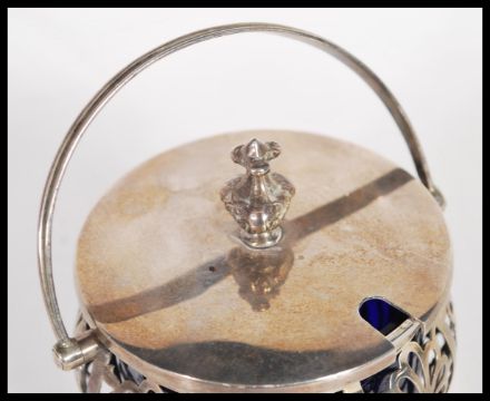 An early 20th Century hallmarked silver large jam or condiment pot having original blue glass liner. Hallmarked for Sheffield 1923 makers Robert Pringle & Sons. Weighs 156.9 grams without liner. 11cm tall.