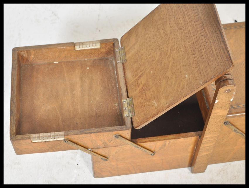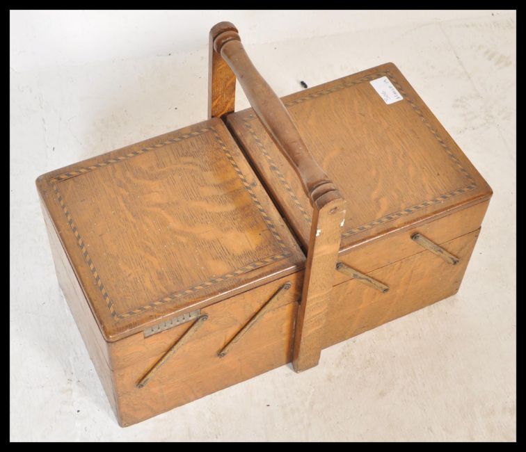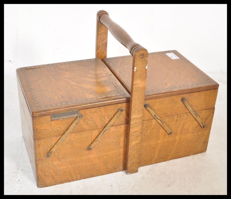 A 20th Century retro concertina sewing work box with metamorphic scissor action, inlaid detailing to top with carry handle above.