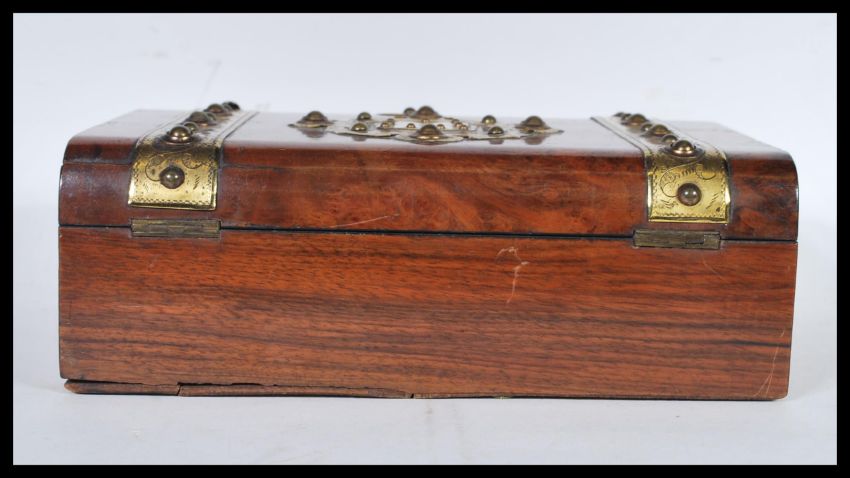 A good George III burr walnut and brass bound workbox being fully appointed with inset ivory cartouche panel to centre