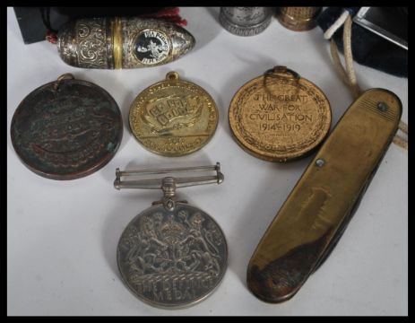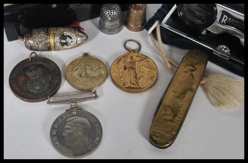 A collection of early 20th Century items to include a WWI first world war victory medal, a WWII Defence medal, an Education Committee Good Attendance medal, a folding knife with a brass handle and embossing of a soldier on it, two thimbles, a thimble / needle case, a pair of Rand No. 1 opera binoculars within a handled tin. 6cm high 13cm wide.