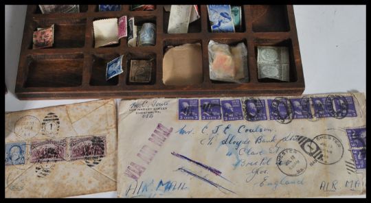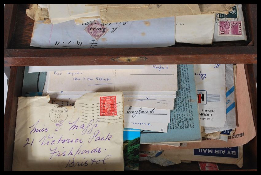 A collection of world stamps dating from the early 20th Century to include Indian, Canadian, Great British, German etc. Some contained within an album to include loose as well. Stored in an oak cabinet with hinged lid and drawer to front.