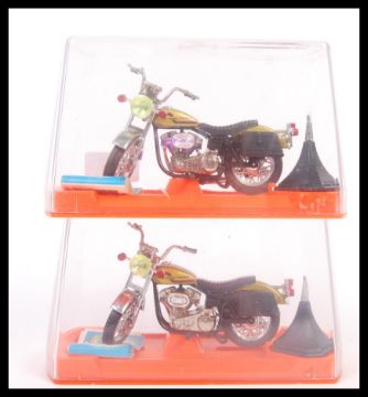 Two Guiloy made Harley Davidson AMF - Ref 111 scale diecast model motorbikes within their original display boxes.